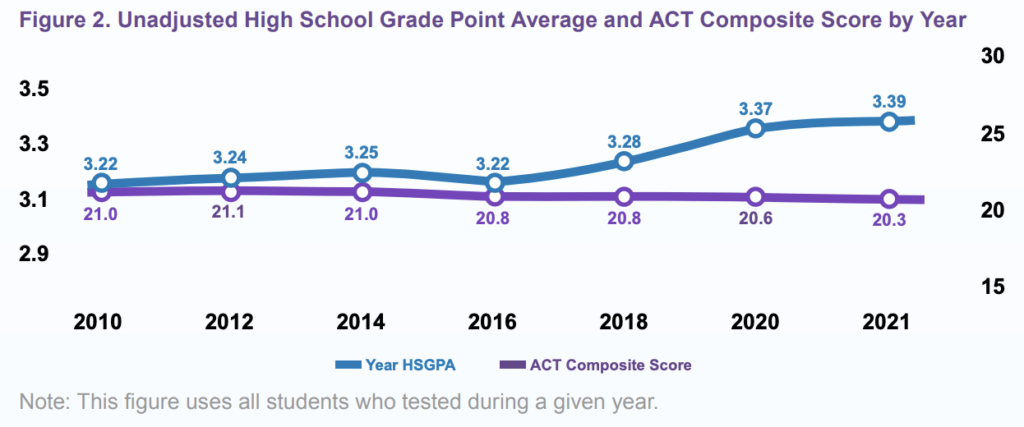 Research by ACT found that the average high school GPA increased from 3.17 in 2010 to 3.36 in 2021. Americans aren’t getting smarter; high school grading is just getting easier. Standardized testing scores, the most objective way of evaluating a student’s academic standing, have remained the same or have fallen, while GPAs are increasing.